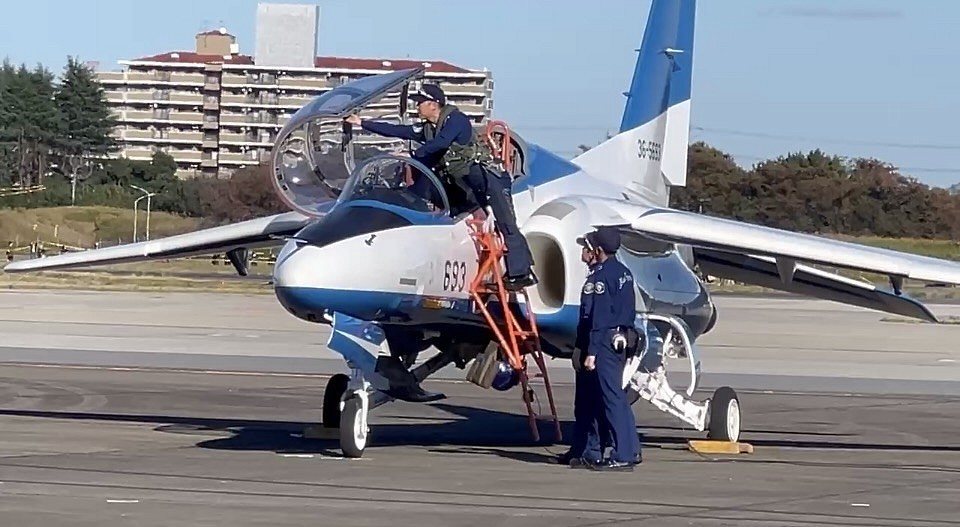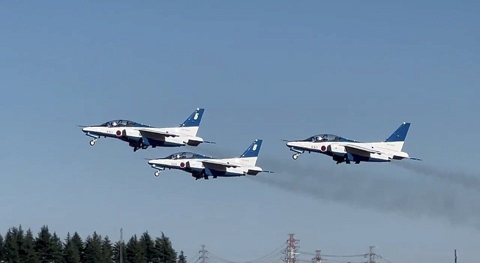 使用機:川崎重工 T-4中等練習機ブルーインパルス仕様(T-4は戦闘機パイロット訓練用)