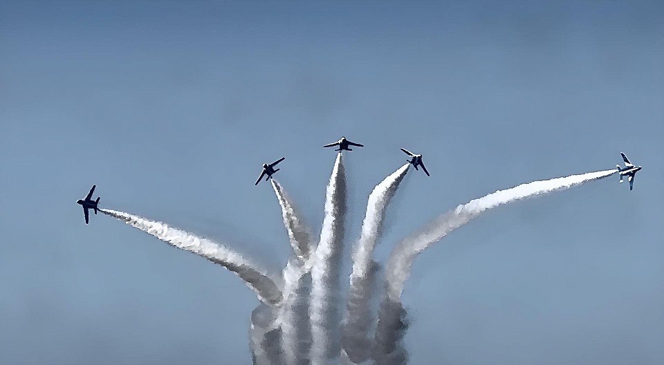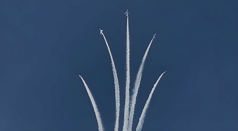 5機が会場正面から広がるように飛ぶ、まるで朝日みたい🌅 - バーティカル・クライム・ロール