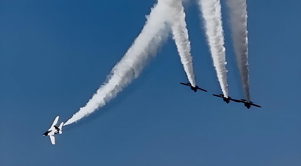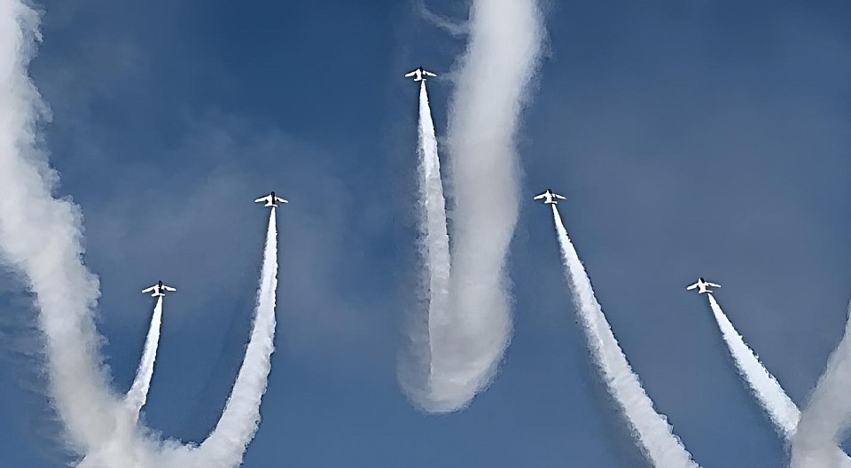青空に映える真っ白な機体、そろった編隊のシルエット、ふわふわスモークが描くやさしい曲線…。