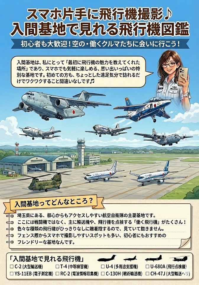 入間基地は、私にとって「最初に飛行機の魅力を教えてくれた場所」であり、スマホでも気軽に楽しめる、思い出いっぱいの特別な基地です。初めての方も、ちょっとした遠足気分で訪れるだけでワクワクすること間違いなしです🎵